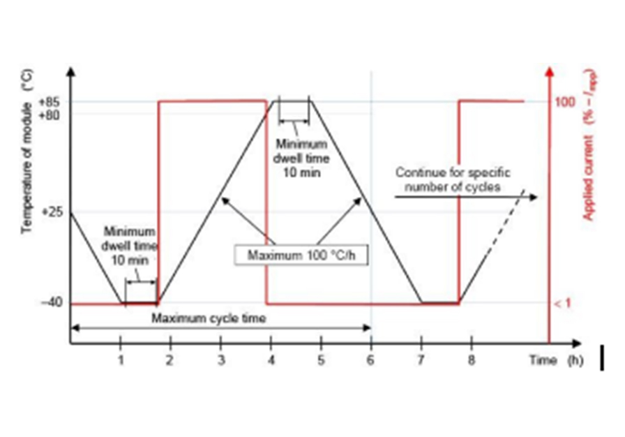 熱循環試驗中從-40°C 到 80°C 加熱段,設置連續的 Isc 電流流經組件。